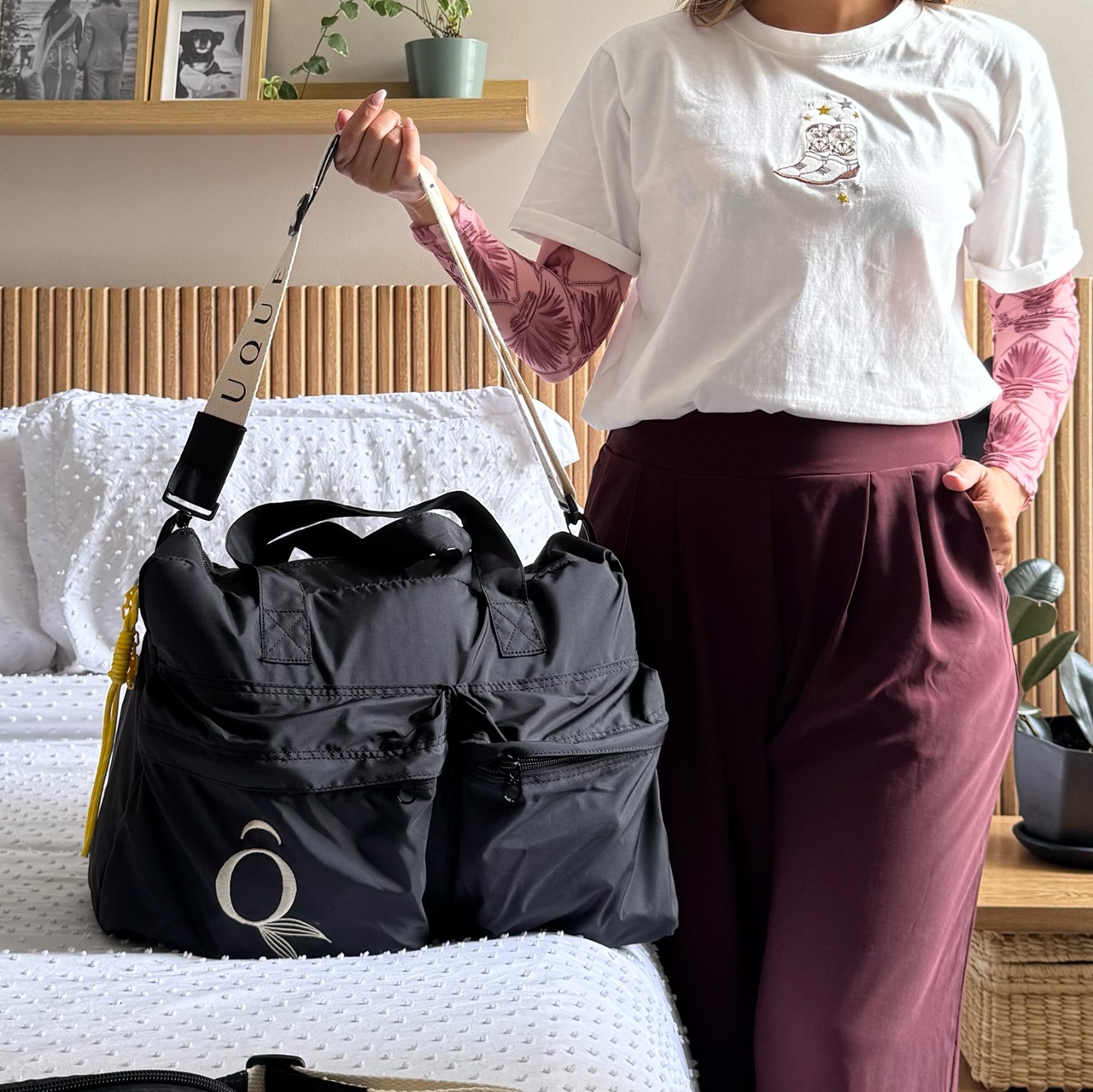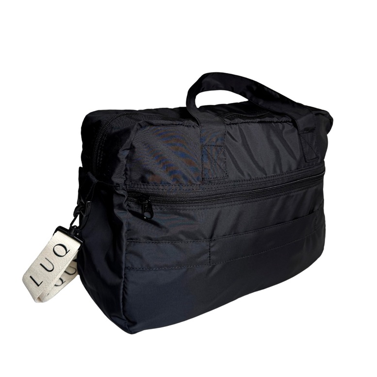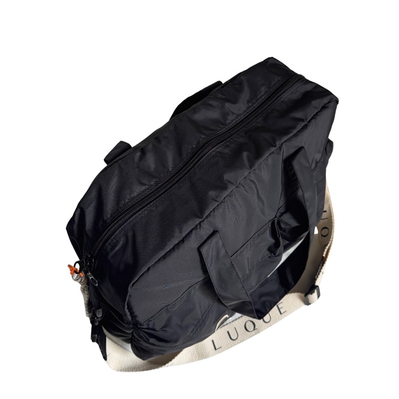 • Tiene un aplique en la parte trasera para ajustar a un soporte de maleta de ruedas
