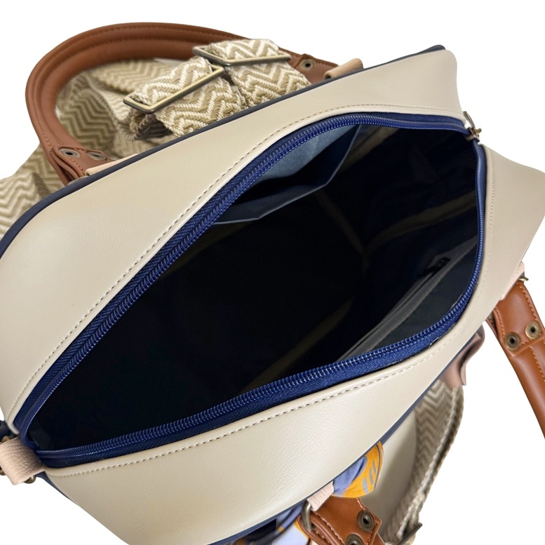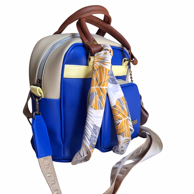 En el exterior, tiene un bolsillo en el frente y otro en la parte de atrás tipo sobre, que sirve también para guardar las correas cuando estás no se estén usando. Además, lleva una pañoleta decorativa que le da un toque chic y hermoso y un charm para guardar monedas o los earpods (el color de la pañoleta y del charm pueden variar dependiendo de la disponibilidad).