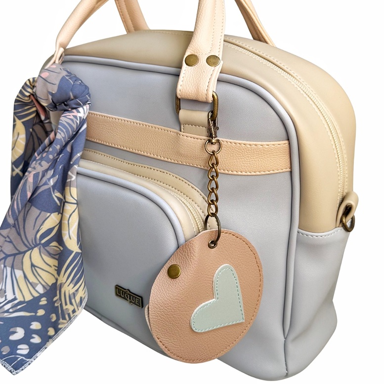 En el exterior, tiene un bolsillo en el frente y otro en la parte de atrás tipo sobre, que sirve también para guardar las correas cuando estás no se estén usando. Además, lleva una pañoleta decorativa que le da un toque chic y hermoso y un charm para guardar monedas o los earpods (el color de la pañoleta y del charm pueden variar dependiendo de la disponibilidad).